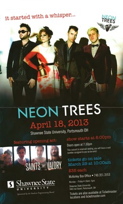 April 18, 2013 Neon Trees Poster. Main Act Neon Trees. Opening act Saints of Valor